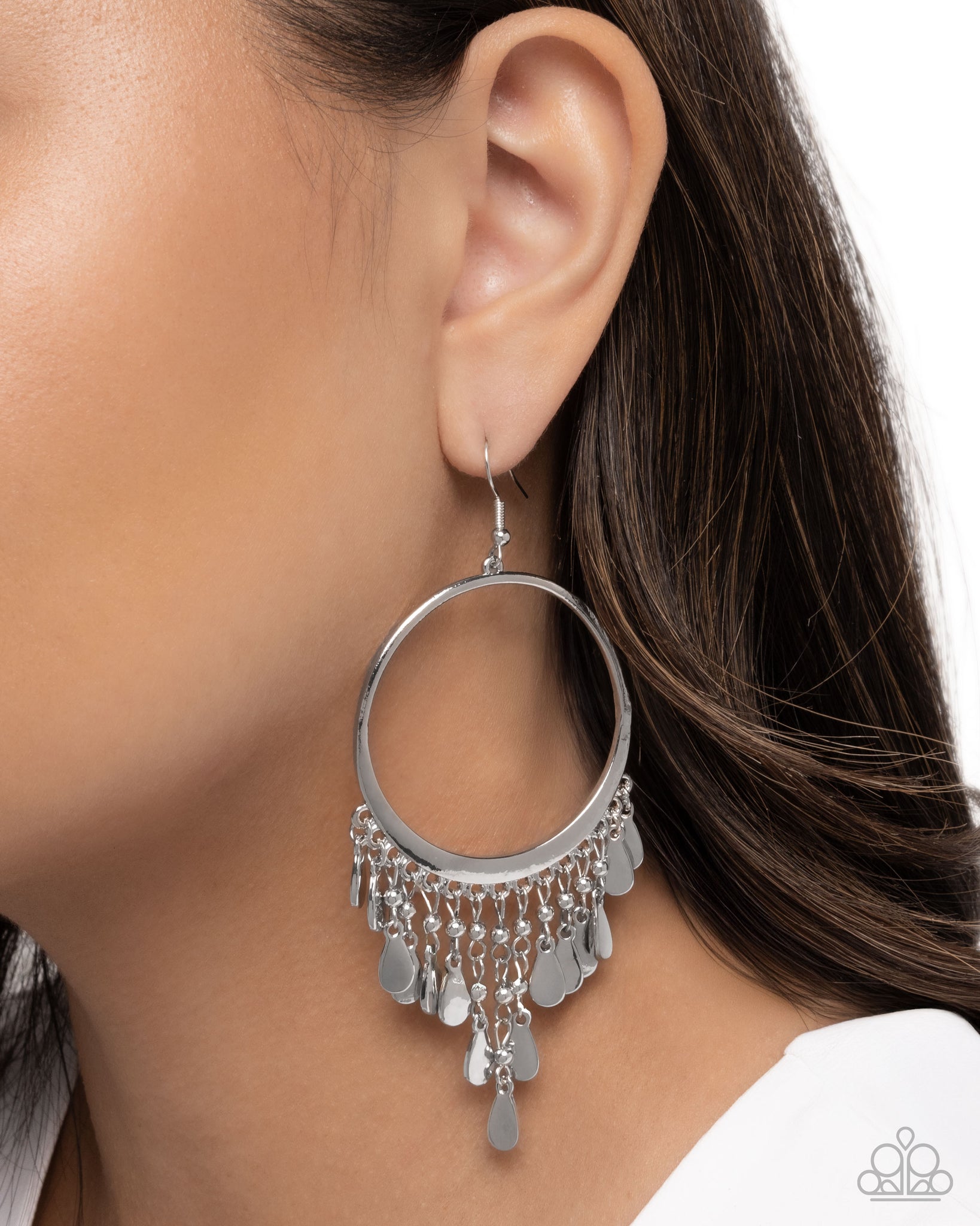 Shimmery silver teardrop discs and studs dance along the bottom of a sleek silver frame that delicately thickens into an airy hoop, creating a playful tapered metallic fringe. Earring attaches to a standard fishhook fitting.