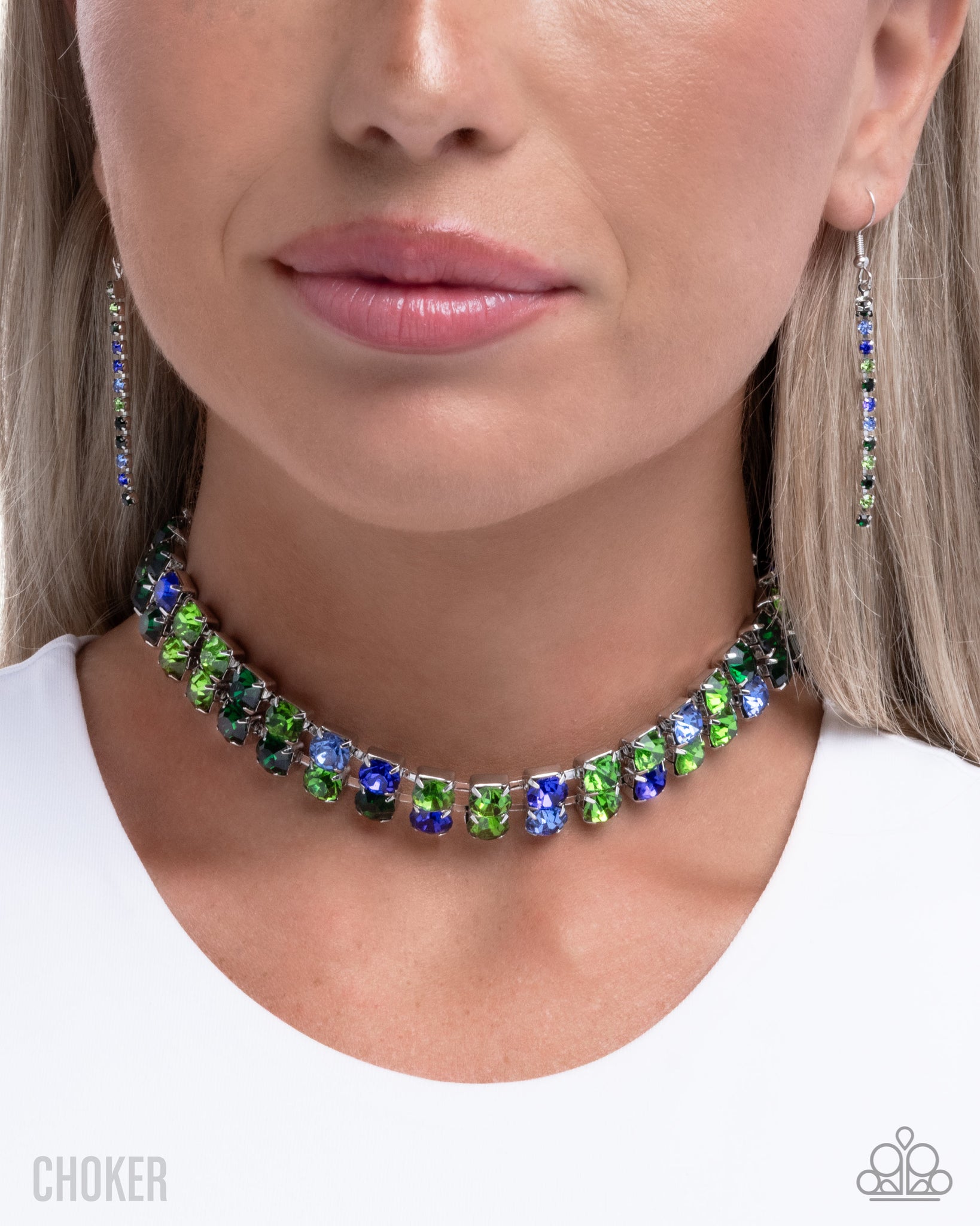 Pronged in silver square fittings, a collection of multicolored blue and green gems layers in glassy rows below the neckline for a colorfully chic display. Features an adjustable clasp closure.