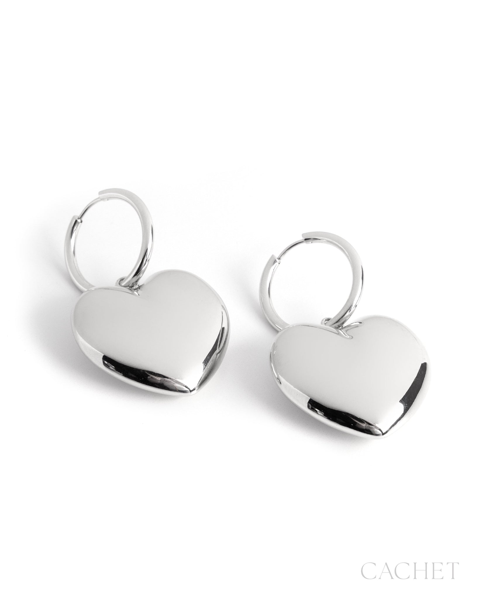 Like the flutter of first affection, the earrings "Crush" curve below the ear, showcasing their oversized heart-shaped pendants that dance with playful charm and tender luster.