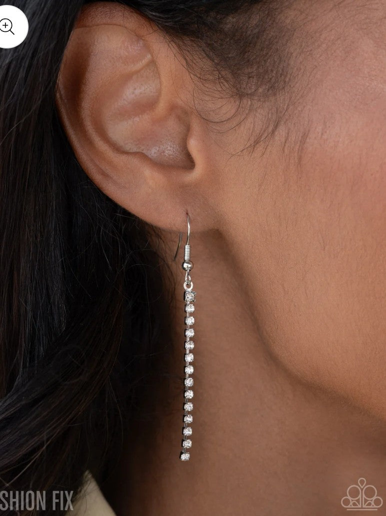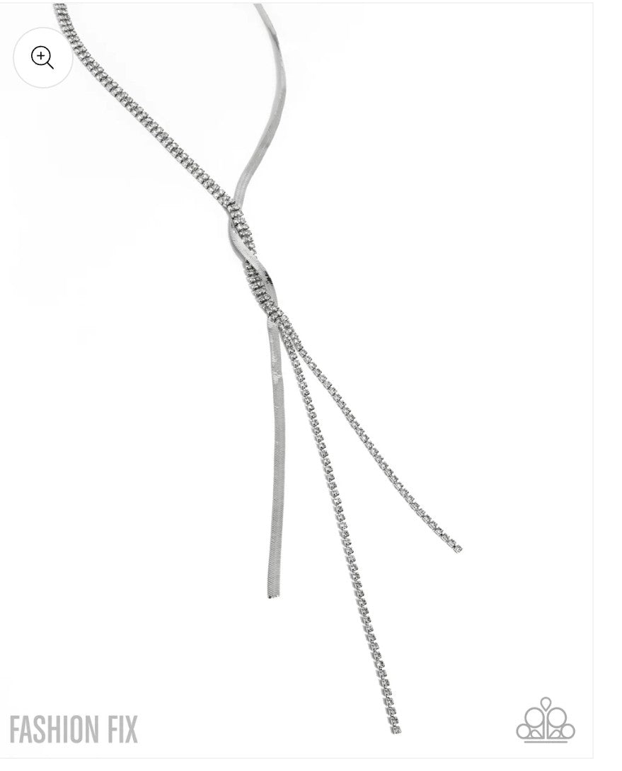 Pressed in silver square fittings, dual strands of glassy white rhinestones loop around the neck beside a silvery herringbone chain ribbon, delicately splitting into an icy tassel below the chest. Features an adjustable clasp closure.