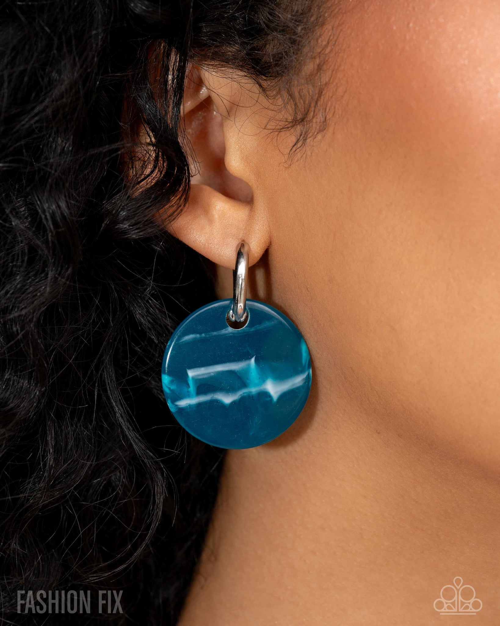 Featuring a subtly swirled print, a flat blue acrylic disc sways along a glistening silver hinge hoop for a fun-loving artisanal look. Earring attaches to a standard hinge closure fitting. Hoop measures approximately 1/2" in diameter.