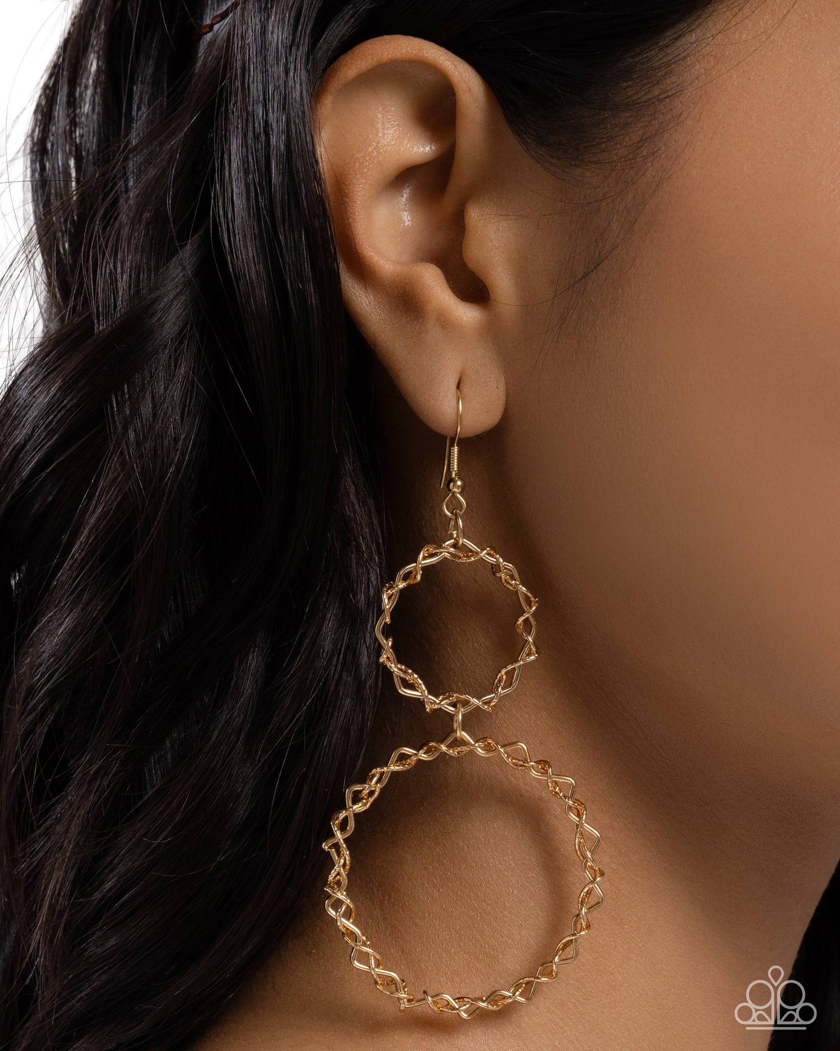 Strands of shiny and textured gold wires are twisted and braided together to form two rugged glittery rings. The larger ring connects to the bottom of the smaller ring, creating a striking lure with an industrial vibe. Earring attaches to a standard fishhook fitting.
