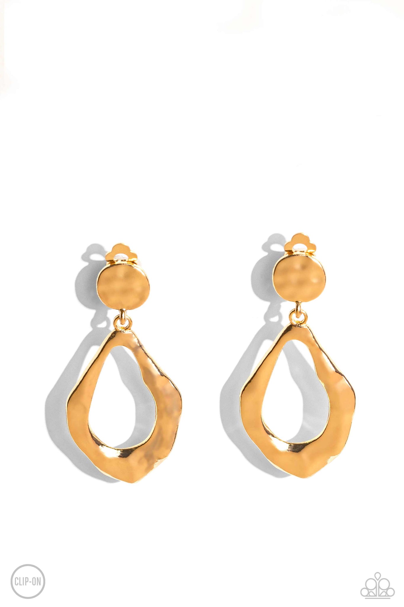 A warped shiny gold teardrop frame links to a hammered shiny copper disc, creating an edgy metallic lure. Earring attaches to a standard clip-on fitting.