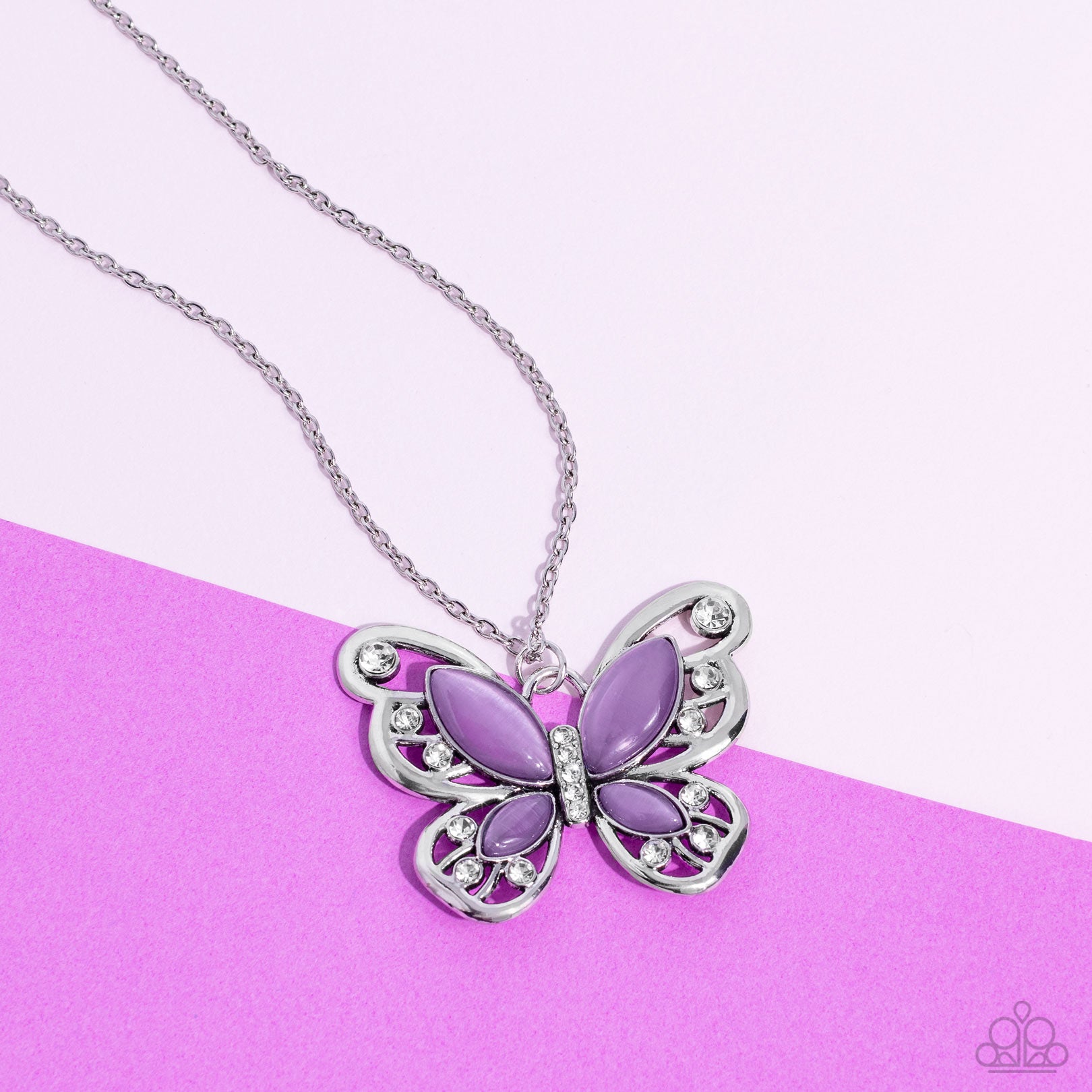 Swirls of silver filigree curl into the shape of a butterfly, creating a whimsical pendant that swings from the bottom of a long silver chain. Glassy purple cat's eye stones layer atop the silver filigree, adding three-dimensional detail and a fresh pop of color, while classic white rhinestones line the center of the design and dot the wings. Features an adjustable clasp closure.